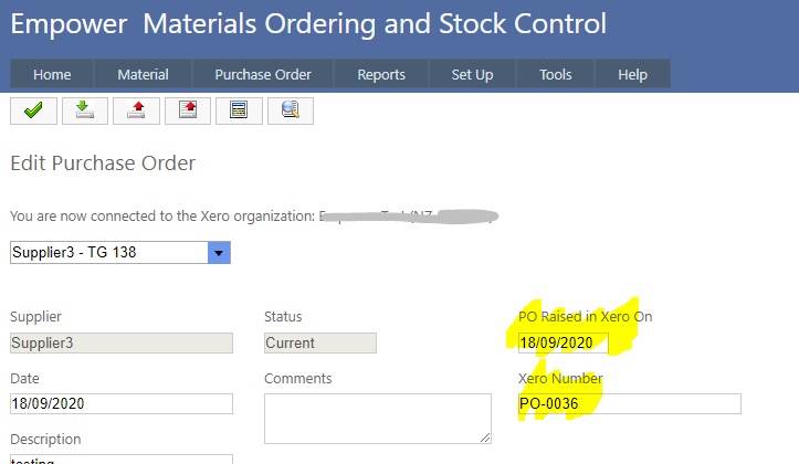 3. Once a Purchase Order is raised in Xero (from within Empower) and provided you are connected to Xero, then the Xero Purchase Order number and the date the Purchase Order was raised in Xero will be visible in the Purchase Order > Edit page - see highlighted below.