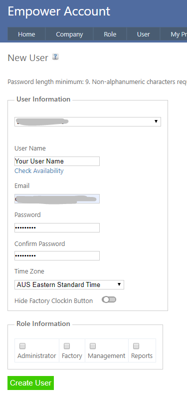 Enter a new User Name an email address and password details. Note that Empower requires passwords to be 9 characters or longer.