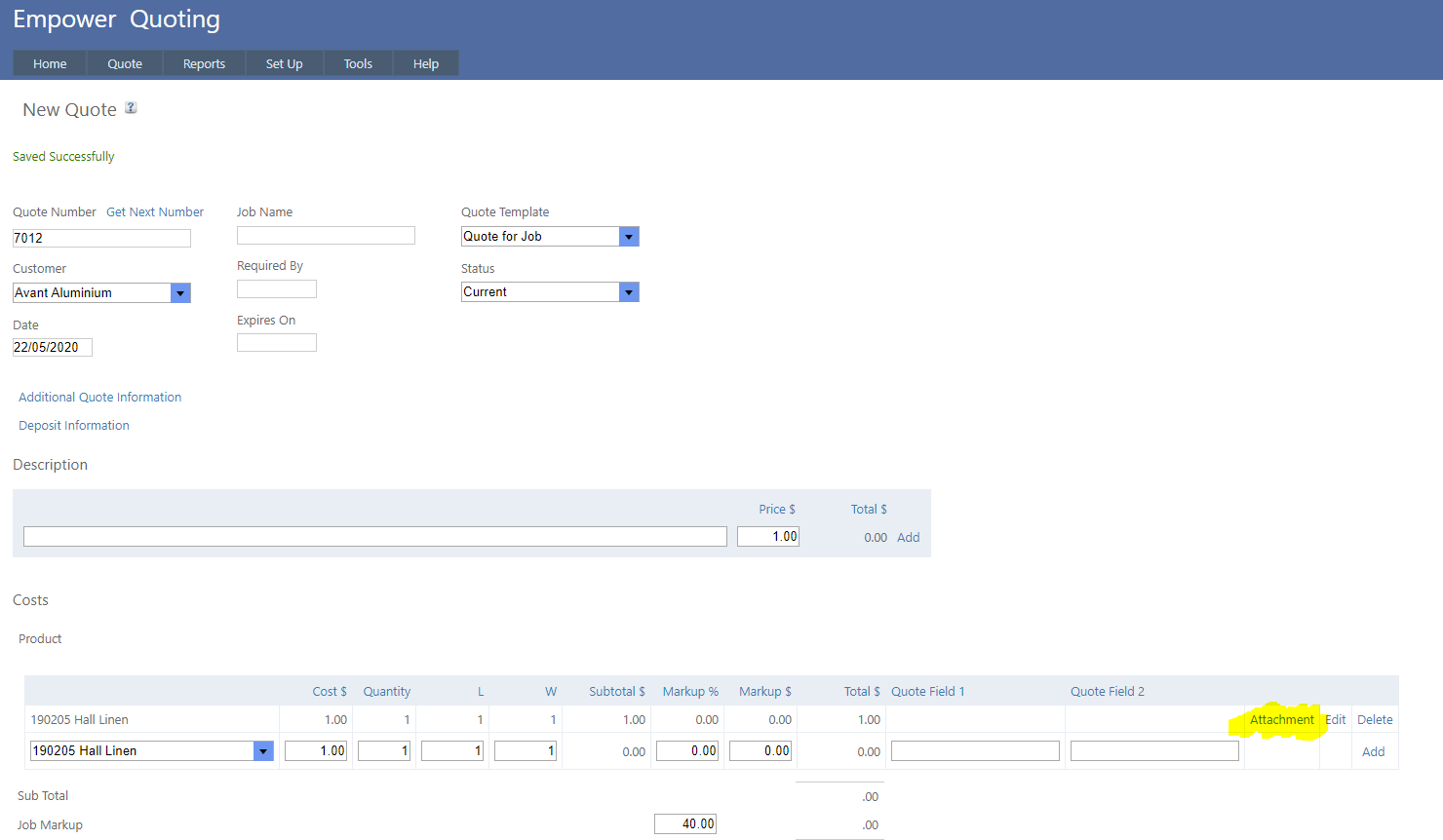 3. On creating a new Quote (or editing an existing Quote) an Attachment button will be visible for each Product (see highlighted below)