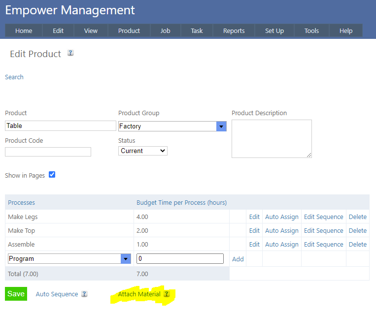 If you have a licence for Empower Materials and Stock control, it is possible to quickly and easily create Bills Of Materials (BOMs) by simply attaching Materials to Products.