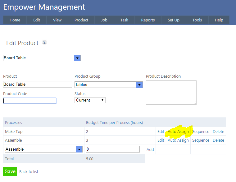 Then click on Auto Assign. The next time a Job is created for that table you will find that the make legs Task is automatically Assigned to Bloggs.