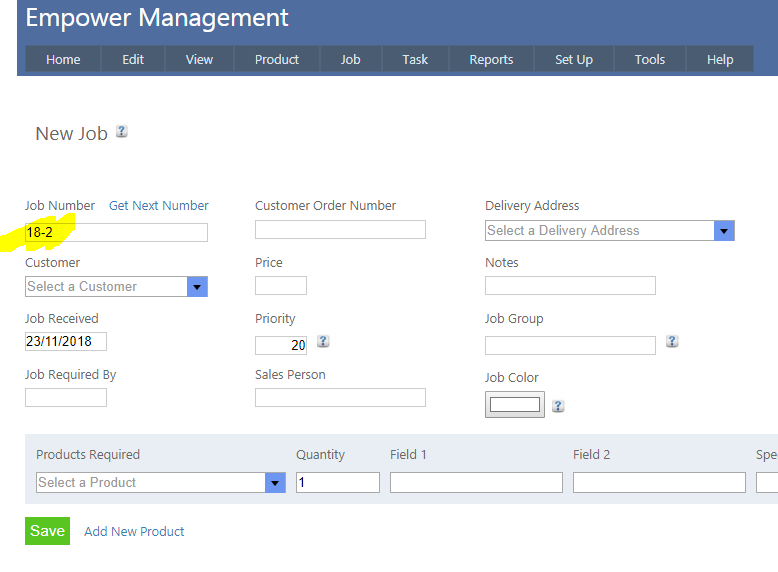 9. Clicking on that will get the next Job Number (see highlighted below)