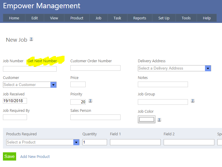 8. Once these are set up Automatic Job Numbers are enabled. In the Job > New page you should see a new button Get Next Number (see highlighted below).