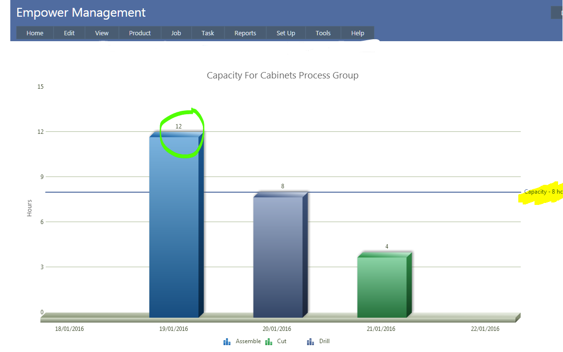 The above example shows the Capacity for the Cabinets Process Group. This Process Group has a daily capacity of 8 hours (highlighted above in yellow).