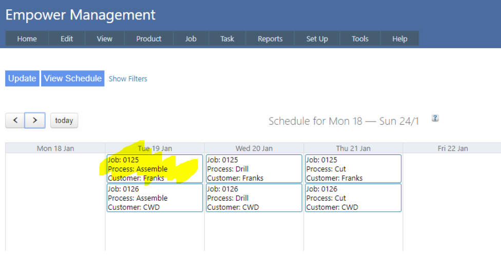 Empower's Capacity Planning supports the drill down of Scheduled Capacity and the drag and drop of tasks to fix Capacity issues.