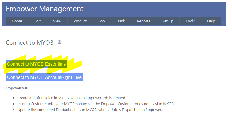 Home > Factory Productivity and Scheduling > Advanced Topics > Import Export Data > MYOB > MYOB Essentials > Connecting to MYOB Essentials