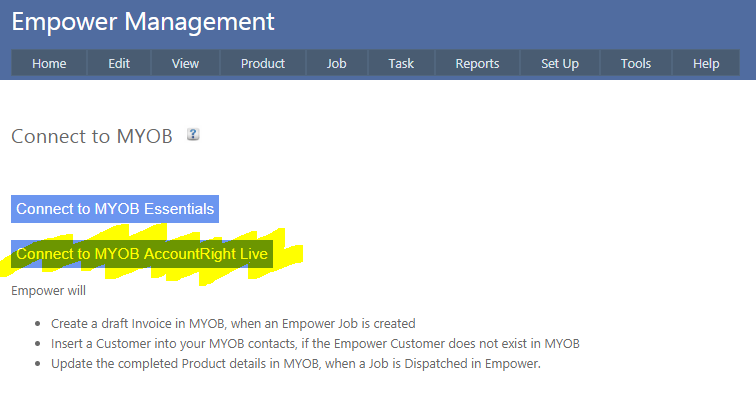 2. Now login in to Empower, and from the Main Menu select Tools > Connect To > MYOB and click on the Connect to MYOB AccountRight Live button (highlighted below).