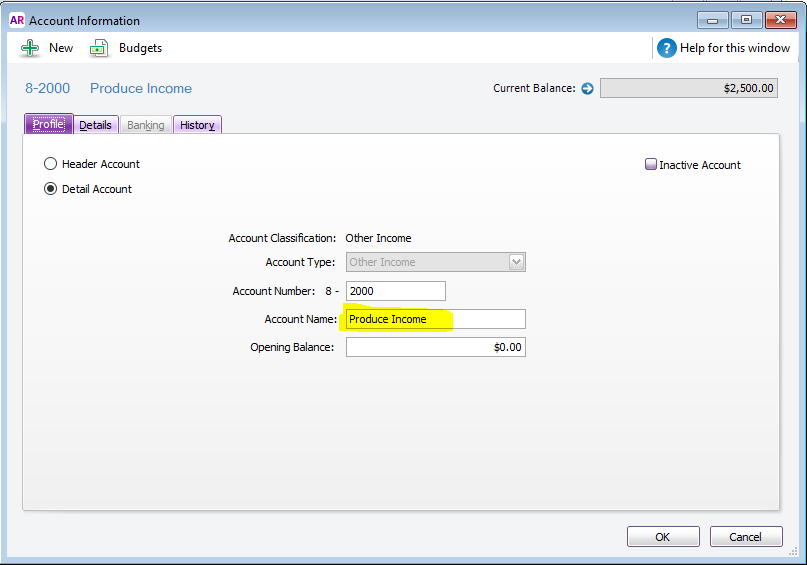 Type in a new Account number (see below - 2000 as an example) and then under Account name type in Produce Income and click OK.