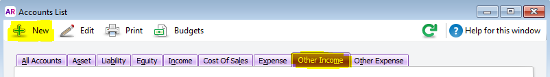 Select the Other Income tab and click New (as highlighted below).