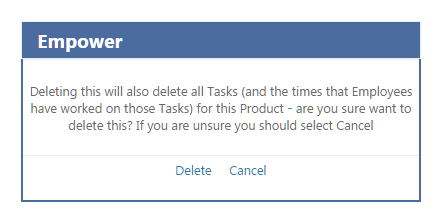 Be very careful when deleting a Product as this will also delete that Product and all the Tasks, budgets and times that Employees have spent on that Product.