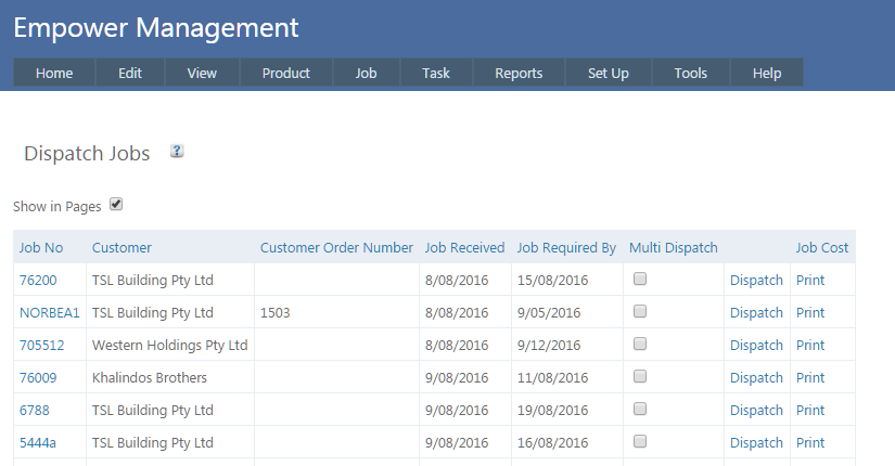 To Dispatch more than one Job at the same time click on the Multi Dispatch check box for each Job you want to Dispatch. Then click on the Multi Dispatch button.