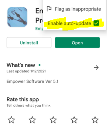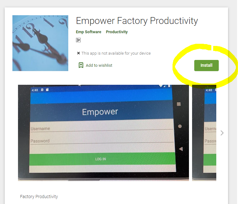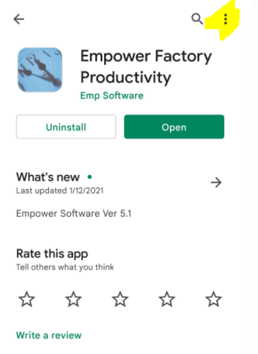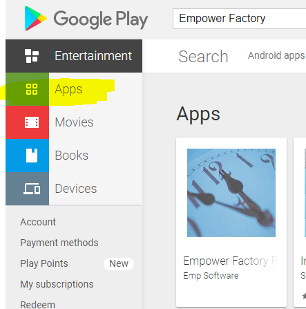 To download Empower's Android app, from your phone navigate to the Google Play store. On the left hand side select Apps (highlighted below) and then search on either Empower Factory or Factory Productivity, You should see a page similar to After clicking on the Empower logo you should see Click on the Install button to install on your phone. At the top right of the page you should see 3 dots - click on these and then select enable auto-update to automatically receive updates. See also Using Tablets and Phones