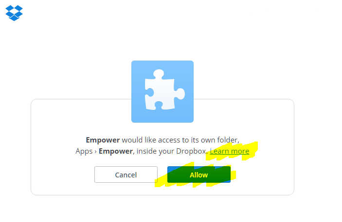 6. Clicking on the Allow button (highlighted above) allows access to your Dropbox files from within Empower. To find out more about what this means click on Learn more (highlighted above).