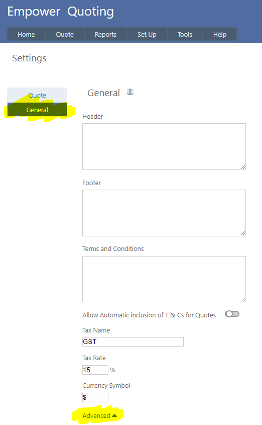1. From the Main Menu, select Tools > Settings - then click on the General Tab and then on Advanced (highlighted below)