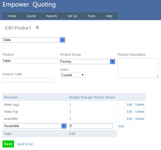 - Delete Processes from this Product. Be very careful when deleting a Process as this will also delete all the Tasks in all Quotes with that Product in it and also times spent on that Process for that Product. Should you delete these, these will not be able to be recovered. This includes Quotes that contain that Product that may have already been accepted and also those that are currently being worked on. If an existing Product has different Processes from those previously used, then it is better to make a new Process with a different name. If you are in any doubt we recommend you not delete it and contact Empower for advice.