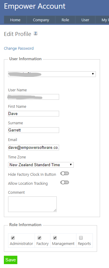 You can edit your User Name, Name, email, time zone settings, hide the green Clock In button, allow or disallow Location Tracking and alter Role Information settings in the Edit Profile page.