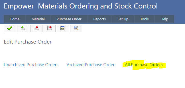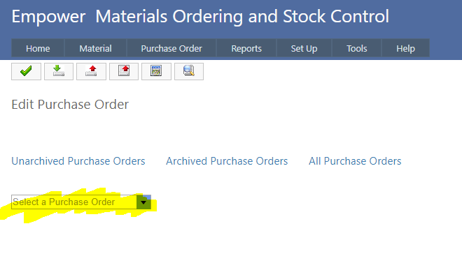 To Edit an existing Purchase Order, from the main menu select Purchase Order > Edit Click on All Purchase Orders (highlighted above) And select the Purchase Order to be edited from the drop down list (highlighted above) You should see a page similar to From this page all items in the Purchase Order can be edited.