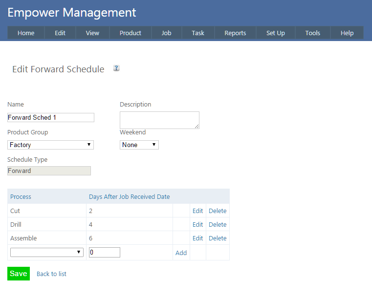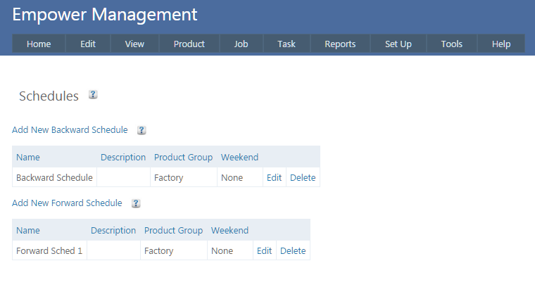 To edit an existing Forward Schedule, from the Main Management Menu go to Set Up > Advanced Set Up > Scheduling > Schedules.
