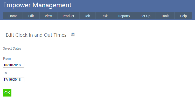 To edit the Clock In and Clock Out times that an Employee has worked, from the Management Main Menu go to Edit > Clock In And Out Times.