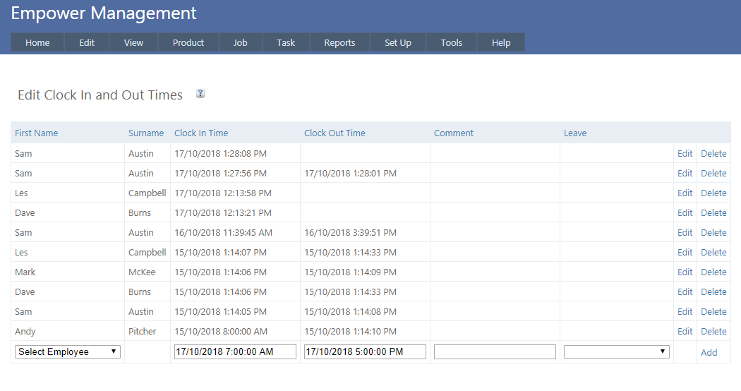 To alter the Clock In or Clock out times click on the time and alter it. Miscellaneous comments can be put into the comment field and Leave can be put into the leave field see also Employee Leave.