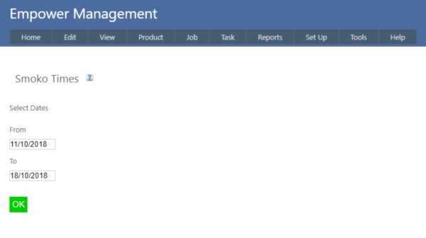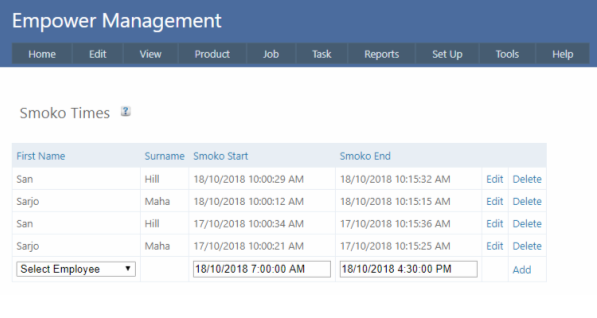 To edit the Smoko break times, from the Management Main Menu go to Edit > Smoko Times.