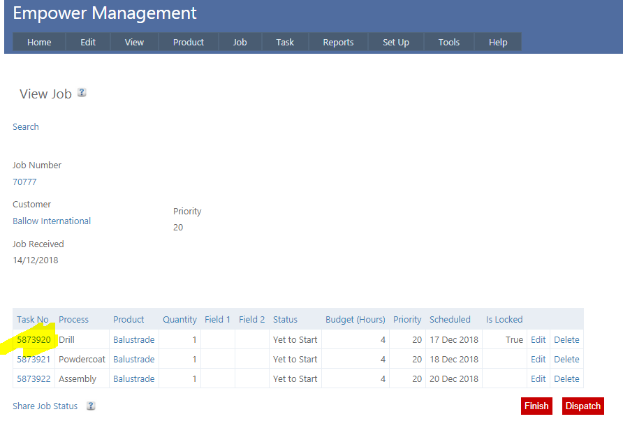To edit a Task, from the Main Management Menu go to Job > View > View Job. You should see a page similar to