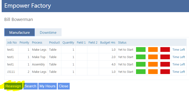 In the Factory Task Start Stop page the Employee will have a new button - Reassign (see below) that allows the Employee to reassign Tasks in the Factory.