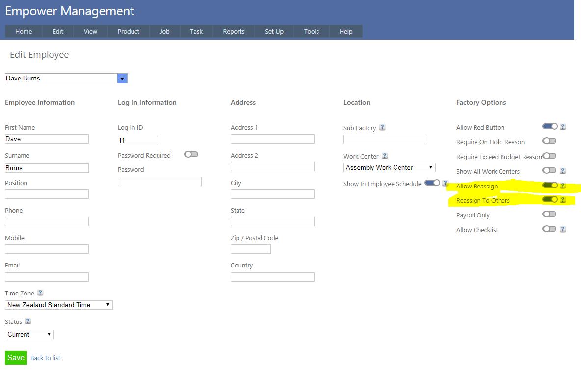 - turn Reassign To Others on to allow the Employee to Reassign Tasks to others.