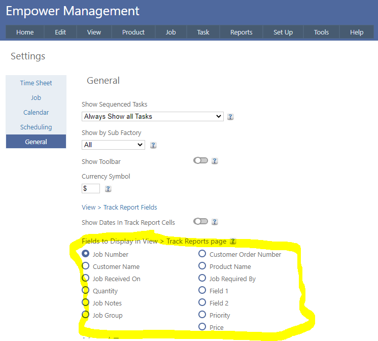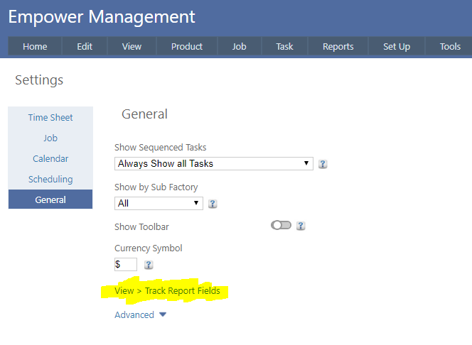 Home > Factory Productivity and Scheduling > Reports > Track Reports > Fields To Display in View Track Reports