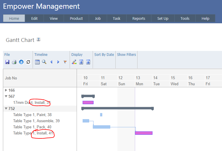 2. For example in the Gantt chart below, the Install Processes (circled in red) are displayed in purple.