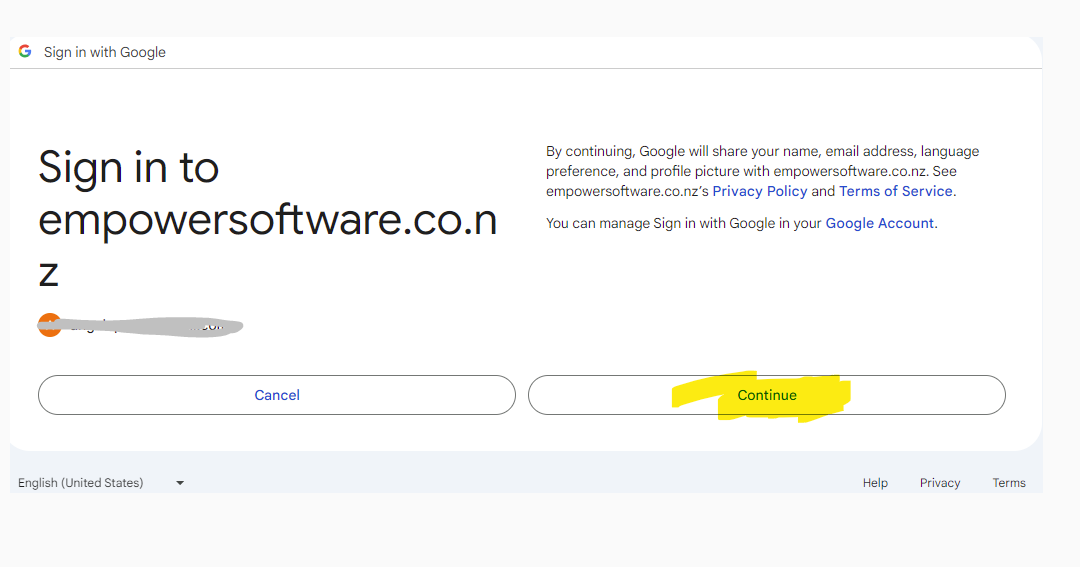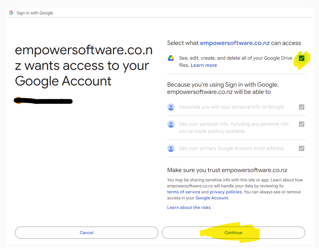 6. After selecting the first check box (see highlighted above, clicking on the Continue button (highlighted above) allows access to your Google Drive files from within Empower.