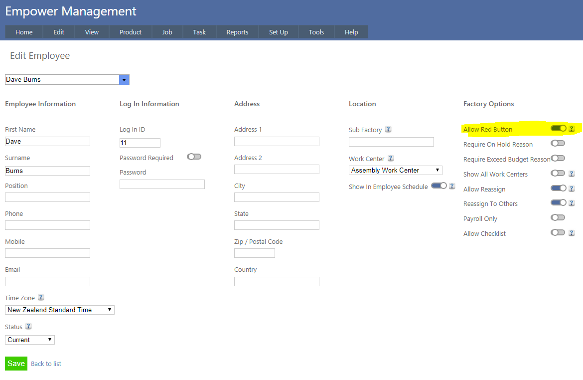 Turning Allow Red Button on (see highlighted above) or off will display or hide the red button for this Employee.