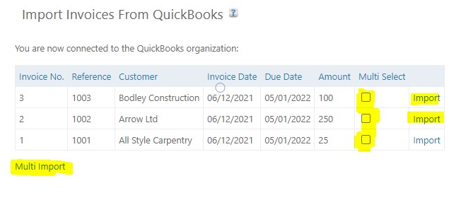 To select multiple Invoices click on the appropriate Multi Select Check box (highlighted above) and then click on Multi Import. A maximum of 15 can be imported at a time.