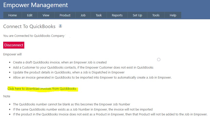3. Click on Click here to download invoices from QuickBooks (see highlighted above).