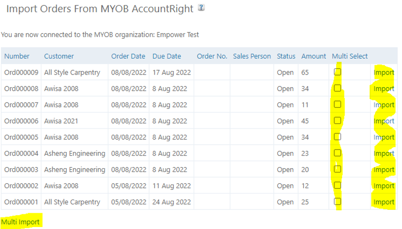 4. Finally either click on Import to import that Job or click on the Multi Select check boxes and then Multi Import to select multiple MYOB Orders to import.