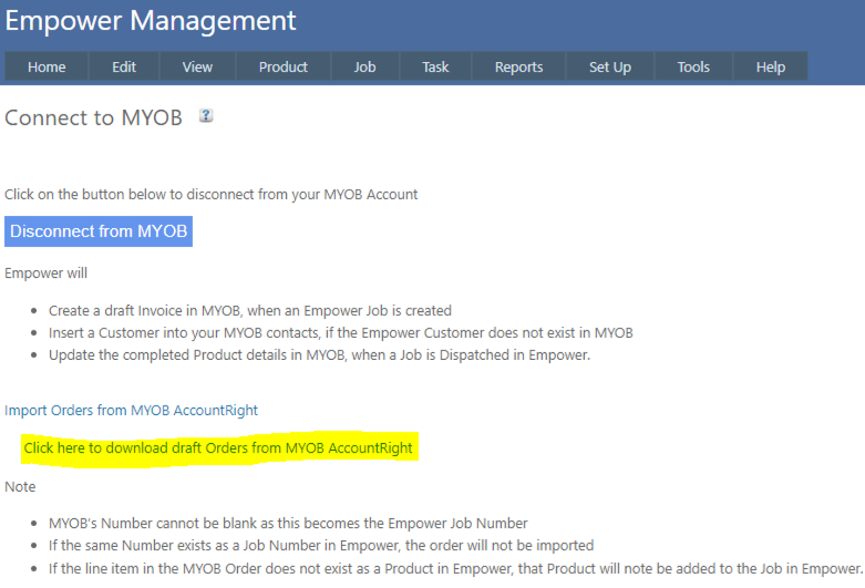 3. Click on Import Orders from MYOB AccountRight and then Click Here to download draft Orders from MYOB AccountRight (see highlighted above).
