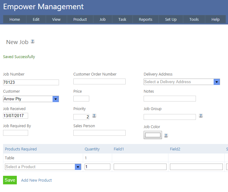 Before entering a new Job ensure you have entered at least one Product - see Setting Up Products.