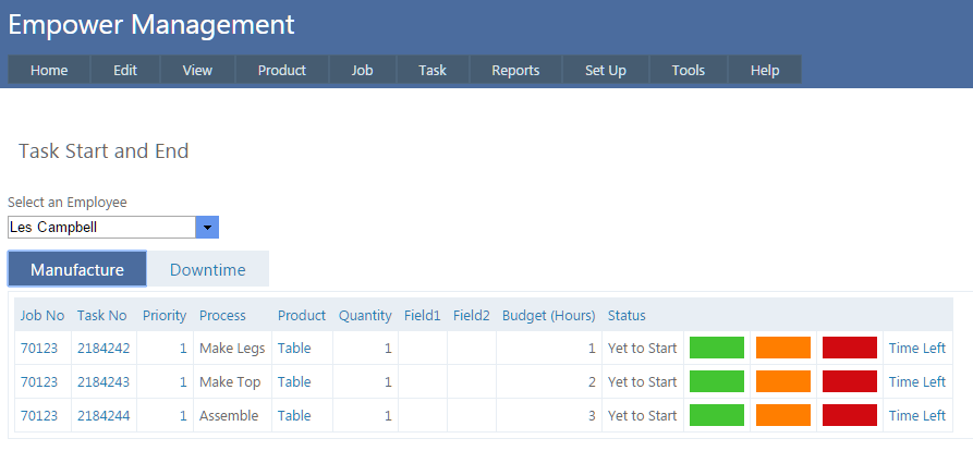 A Task is an activity carried out by an Employee to make a Product – examples of Tasks are Cut Table Legs or Assemble Table.