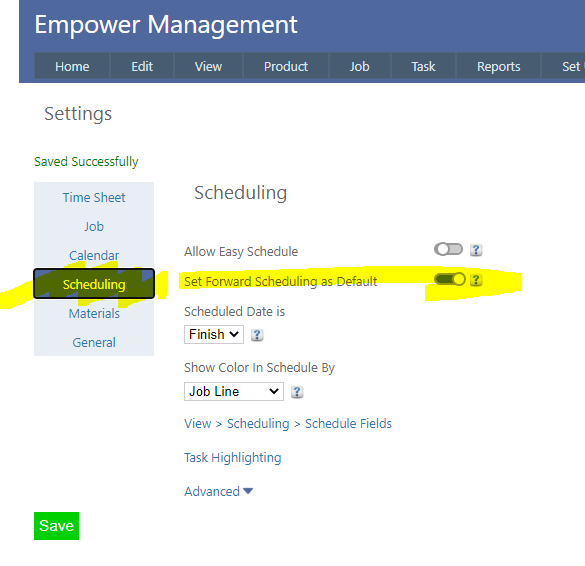 To do this, from the Main Menu, select Tools > Settings then select the Scheduling tab (see highlighted below) and ensure that Set Forward Scheduling as Default is set to off (highlighted below).