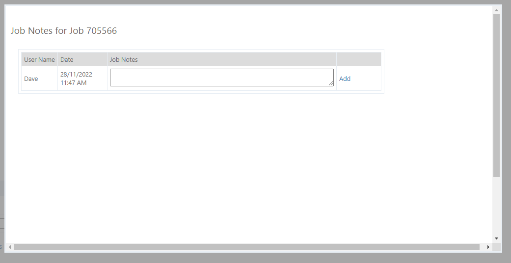 Enter the Job Note and click on Add. There is no limit to the number of notes that can be added. Scroll down to close the Job notes page