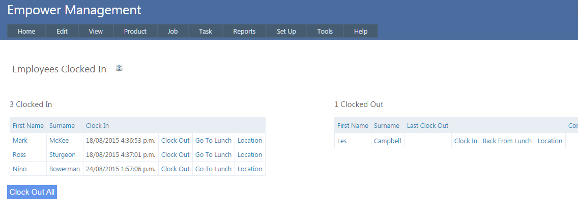 After lunch, clicking on the Back From Lunch button starts the Task or Tasks that the Employee was working on before lunch and Clocks the Employee back in.