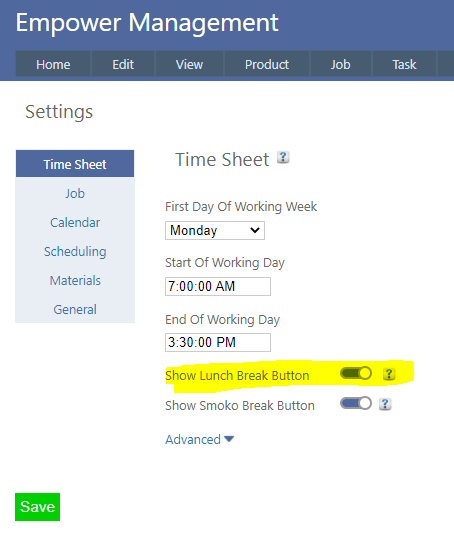 Ensure that the Show Lunch Break button is set to On (as highlighted above). Note that only an Administrator can alter this setting.