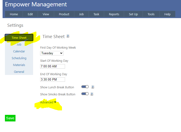 From the Factory version an Employee can see the time spent on Jobs by clicking on the My Jobs button. To set this up, from the Main Management menu select Tools > Options. Ensure that the Time Sheet tab is selected and then click on Advanced. Then ensure the Show My Jobs Button toggle switch is on.