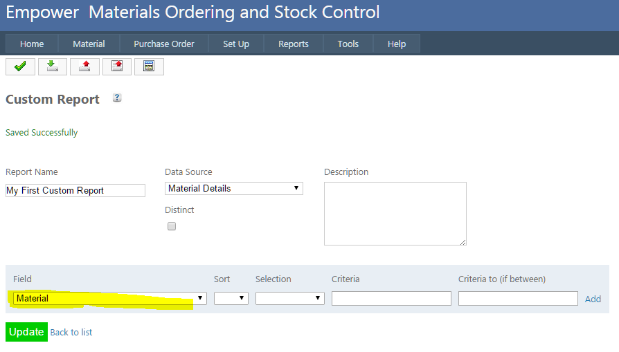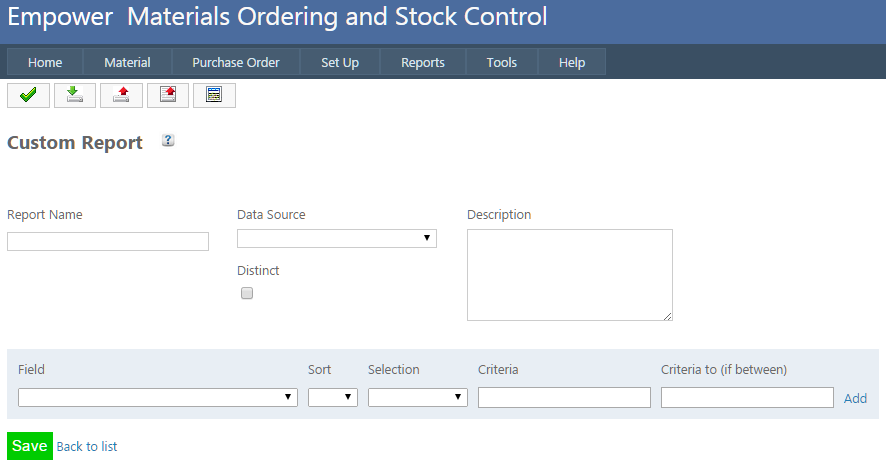 Home > Materials > Reports > Report Writer > New Custom Report