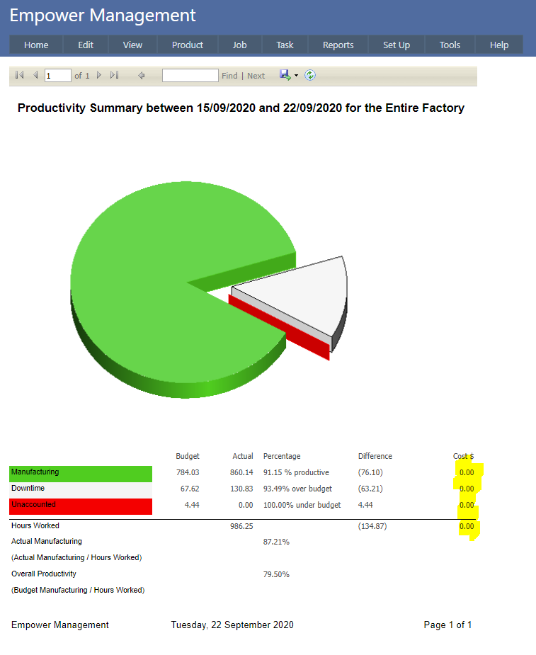 These reports provide a graphical representation of the number of hours worked and how it is split up between Manufacturing, Downtime and Unaccounted time.