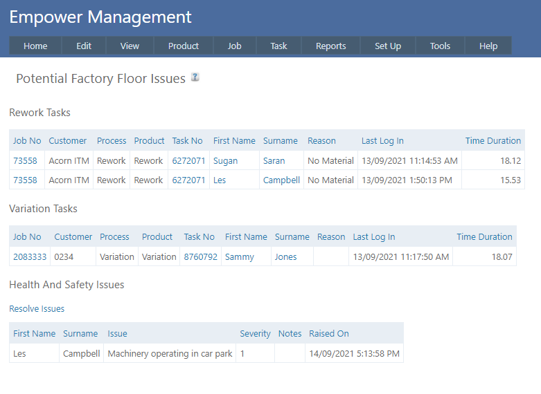 The Potential Factory Floor Issues page allows visibility of currently Active Rework and / or Variation Tasks and / or Health And Safety Issues.