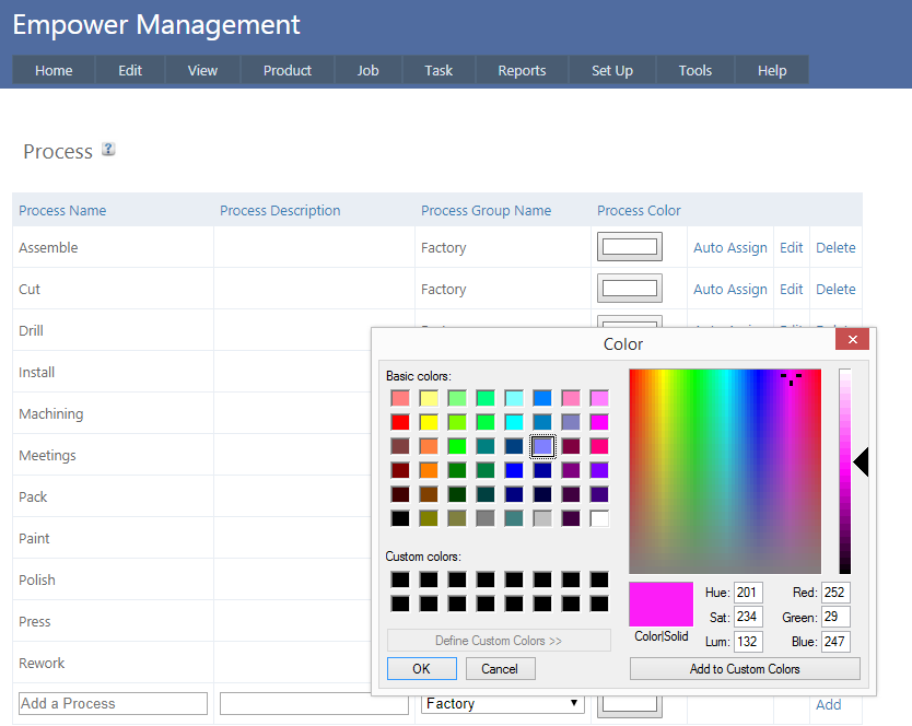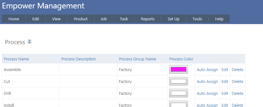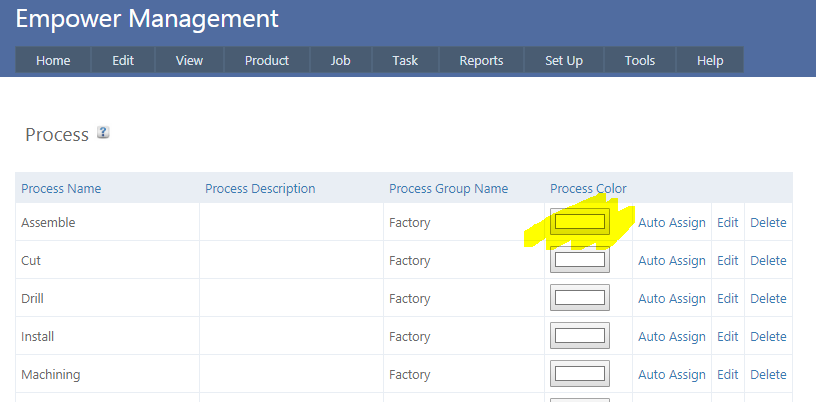 3. Now set up colors for the various Processes. To do this, from the Management Main Menu select Set Up > Process. You should see a page similar to