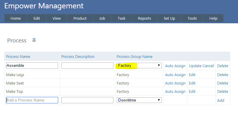 To add a Process to a Process Group, from the Main Management Menu go to Set Up > Process. Next to the Process you wish to edit, click Edit.