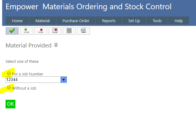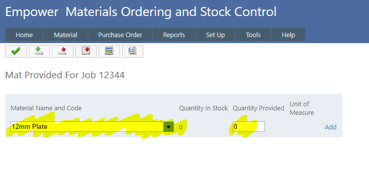 To do this and to update your stock control, from the Main Menu select Material > Provided.