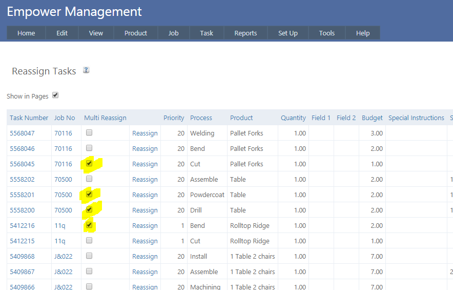 To do this, check the Box under the Multi Assign Column for each Task to be Reassigned (see highlighted example below) then click on Multi Assign.